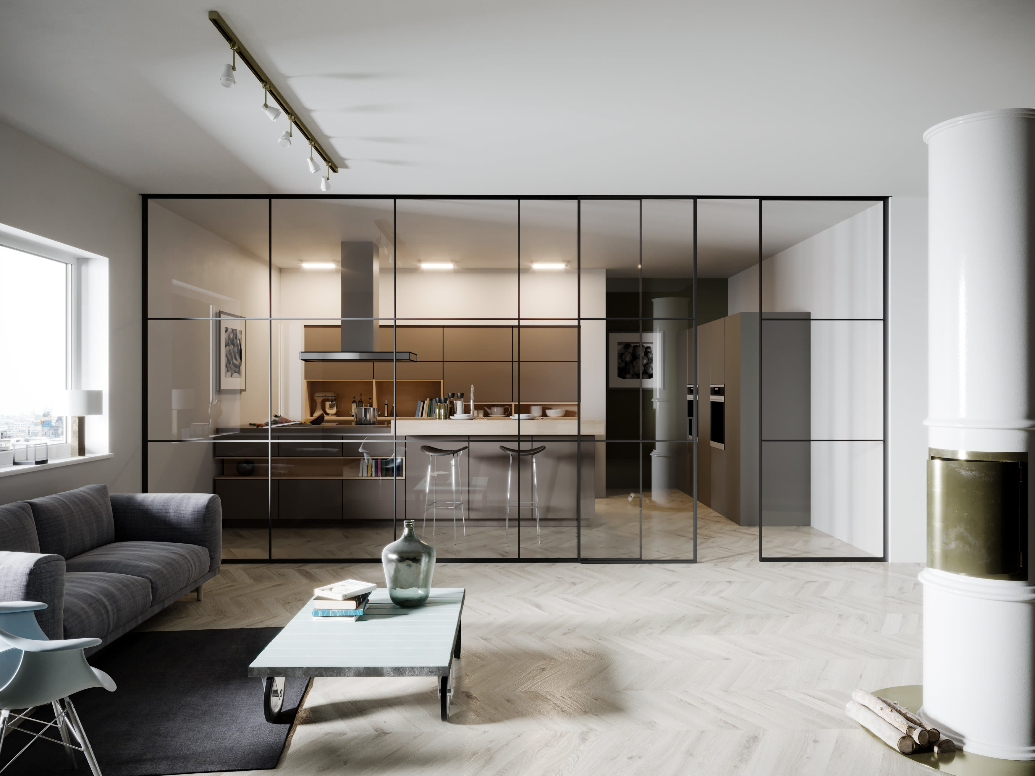 So vedno elegantna tehnična in funkcionalna rešitev za ločevanje prostorov. Zasteklitve izdelujemo po meri in željah naročnika, z kaljenim steklom in obdelavo profilacije po želji.